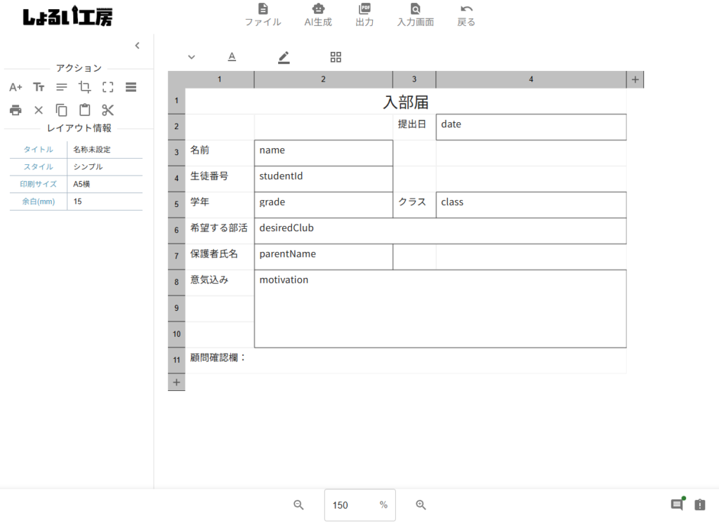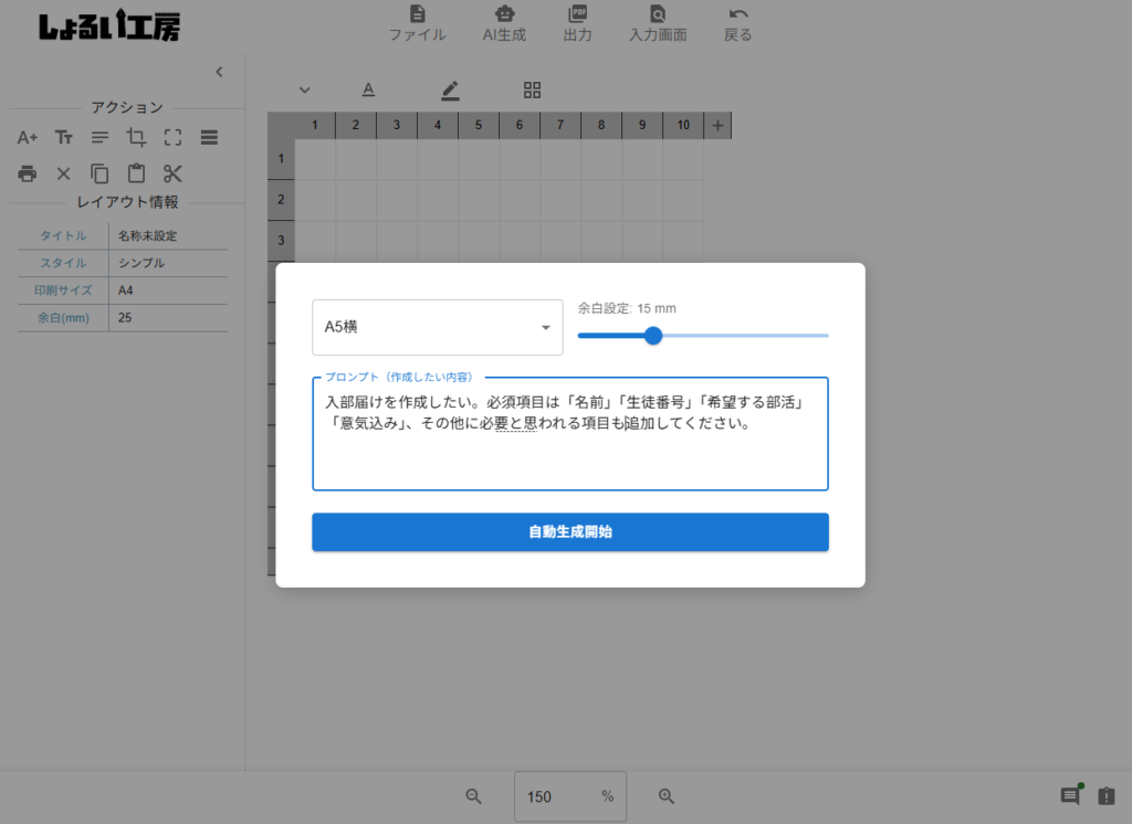 「AI生成」からプロンプトを表示して希望する書類の内容を入力します。