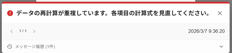 | 「データの再計算」エラーは「計算式」で重複する式を記載している可能性があります。例えばtext項目に対して「=text+1」のような記載をすると、システムが自分自身に対して+1しようと繰り返してエラーとなります。 | 確認項目:「計算式」 |