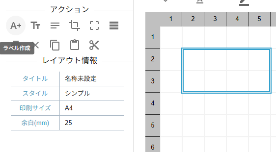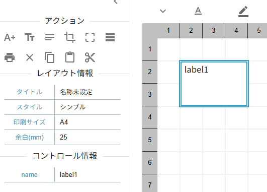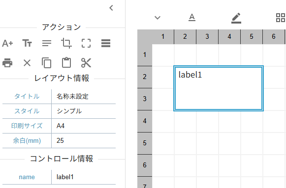 レイアウトの基本となるコントロールの作成をします。コントロールの作成はアクションパネルの「ラベル作成」、「テキスト作成」、「コメント作成」を選択してください。