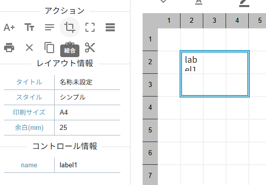 セルを選択した状態でアクションパネルから「ラベル作成」、「テキスト作成」、「コメント作成」を選択すると選択範囲に指定したコントロールが作成されます。またコントロールを作成した後にセルを結合することでも希望する範囲にコントロールを作成できます。