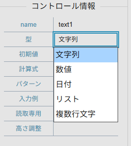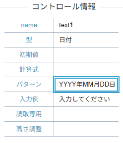 テキストの型には日付、数値、リストを設定できます。これら項目は画面表示の書式を「パターン」により設定可能です。